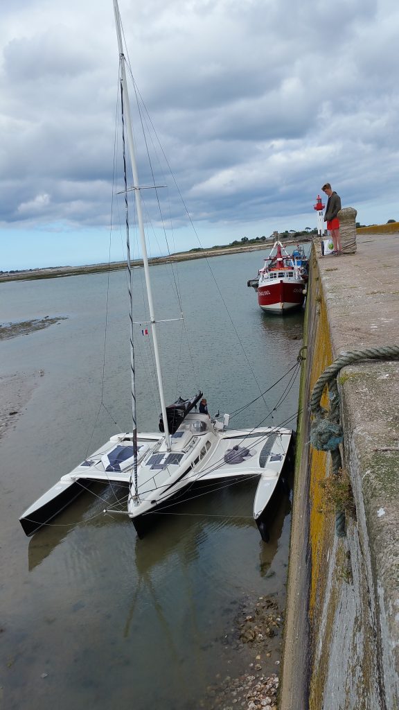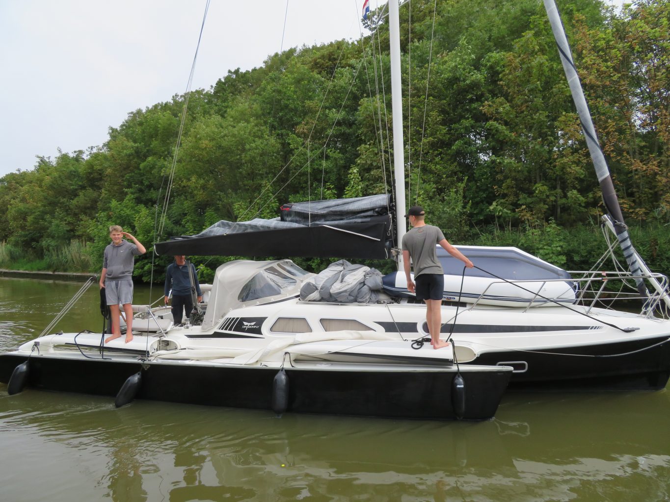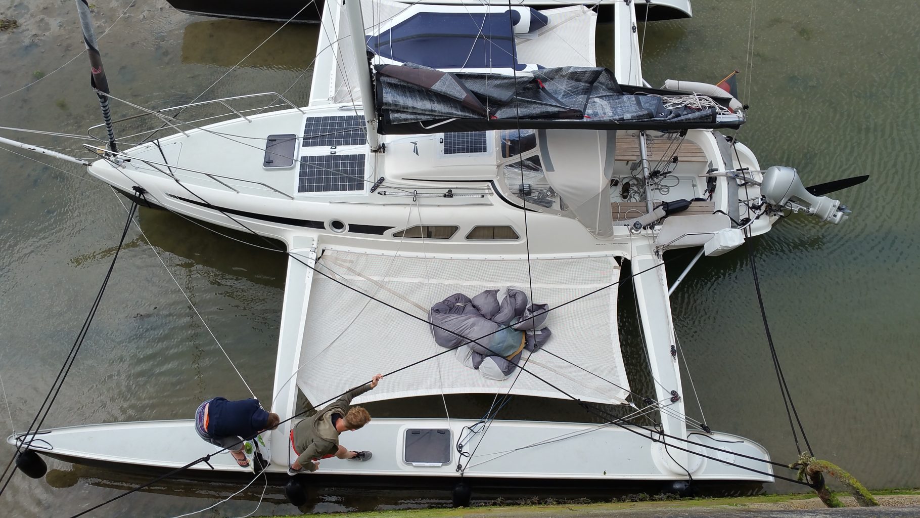 Fazit: Glück gehabt. Das vergleichbar geringe Gewicht hat Trinity gerettet. Selbst der Außenborder springt auf Anhieb an. Sobald der Wasserstand es ermöglicht, der seit dem Höchststand in der Nacht rapide sinkt, legen wir den Mast und beginnen mit dem Auskranen.