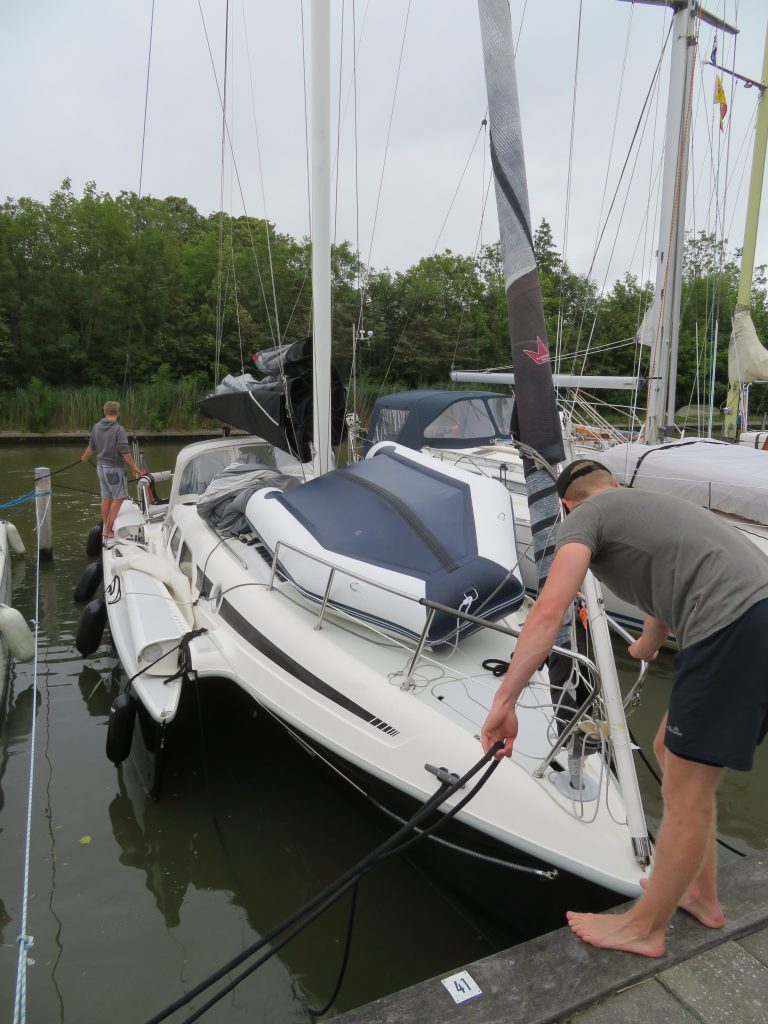 Der Anblick, der sich im Hafen bot, war erschreckend, doch der erste Blick in Richtung Steg 7 ließ Hoffnung aufkeimen. Trinity schwamm noch aufrecht an ihrem Platz. Im Laufschritt ging es zum Liegeplatz. Da lag sie, und es sah alles verhältnismäßig gut aus! Große Erleichterung!