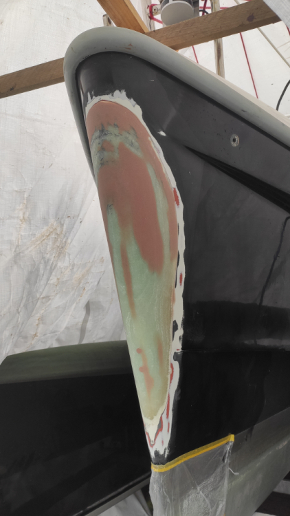 Das Loch wird zunächst von innen durch eine Lage Laminat verschlossen und anschließend von außen mit 16 Lagen Biaxialgewebe neu aufgebaut. Danach Spachtel, Primer, Filler und zum Schluß die Lackierung. Zwischendurch schleifen, schleifen, schleifen.