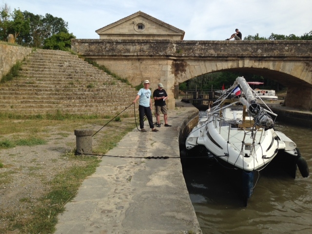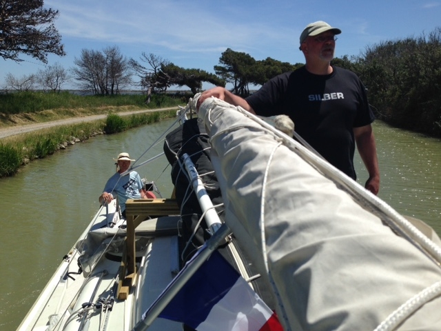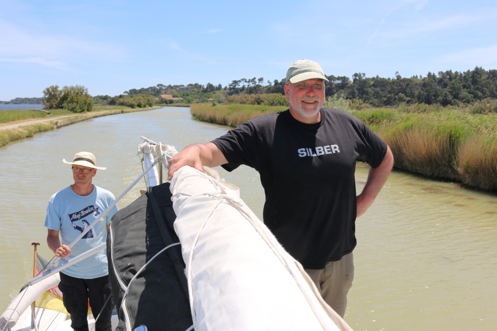 Als Manschaft sind diesmal meine beiden Söhne, Paul und Jakob, mit an Bord. Wir sind Freitag nach Flug und Zugfahrt in Pauillac angekommen. Am nächsten Tag war gleich um 11:30 der Termin zum Mast stellen. Vorher ist noch einiges zu erledigen. Wir haben das gute Stück in Port Leucate wirklich gut verpackt. Vielleicht können wir ja schon am Nachmittag nach Port Medoc aufbrechen. Hochwasser ist gegen 13:00, so dass wir mit ablaufendem Wasser die Strecke zügig in 4-5 Stunde schaffen sollten.