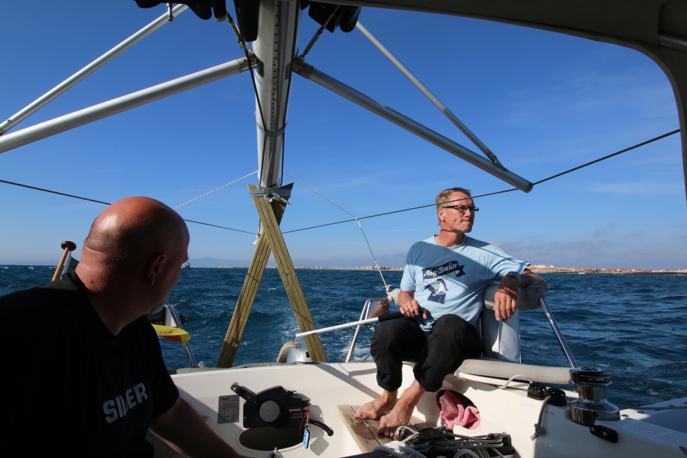 Um 9:15 legten wir ab. Die See vor dem Hafen ist ziemlich kabbelig. Vor der Hafeneinfahrt hat sich schon ein ganzer Pulk von Segelbooten versammelt, die alle dabei sind ihre Segel zu setzten. Alle machen sich in nördliche Richtung auf den Weg. 3-4 Windstärken und halber Wind. Endlich mal Fahrt im Schiff. In dem Pulk fühlt sich das fast an wie auf einer Regatta.Ein großer Mono fängt an seinen Spinnaker zu setzen. Ein abenteuerliches Unterfangen, bei dem spitzen Kurs. Aber schließlich steht das Ding und das schwere Boot schiebt mit viel Lage und mächtiger Bugwelle durch das Wasser.