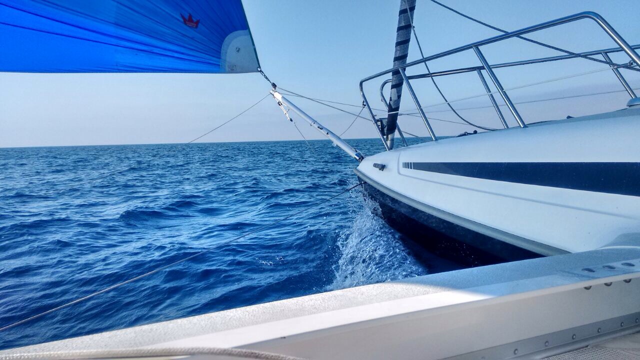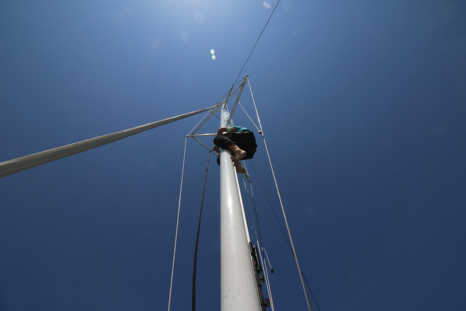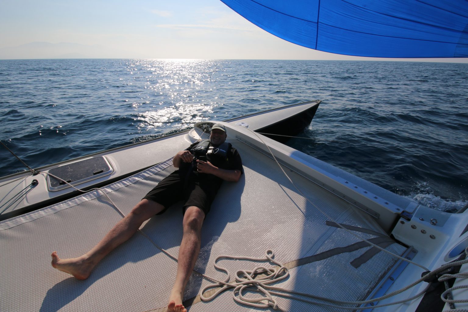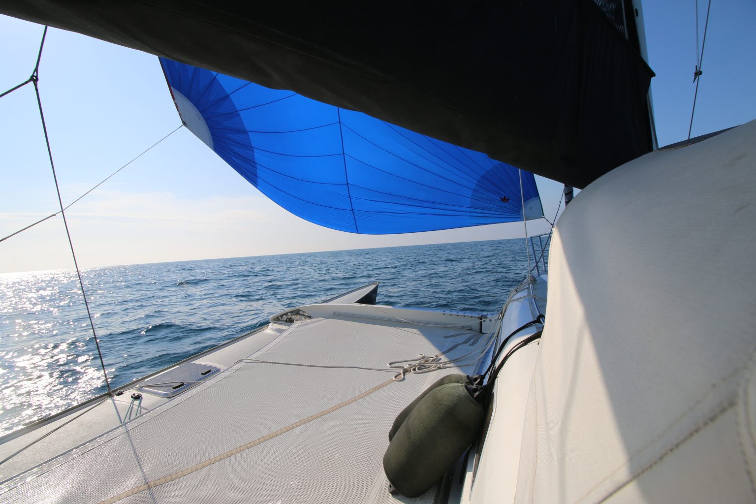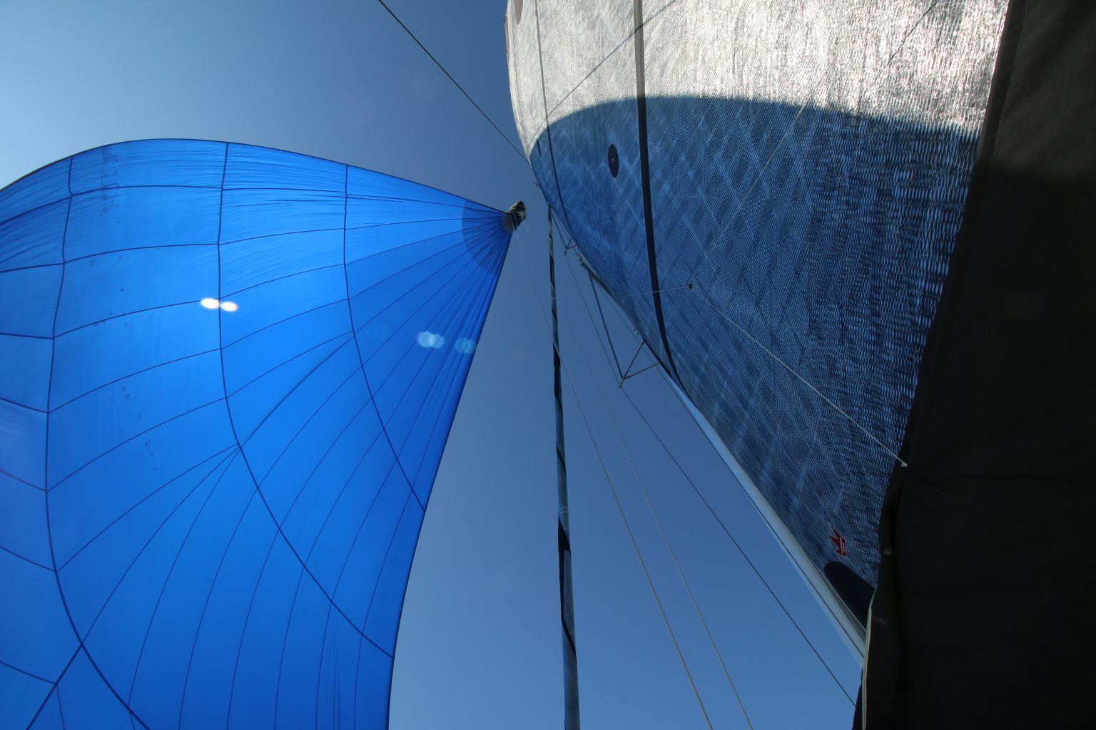 Das ist unser Wecksignal. Wenn der das kann…. Paul, Spinnaker klar machen. Wir brauchen einige Zeit bis wir die ganzen Leinen vorbereitet haben. Aber dann geht’s los. Die 90 qm Tuch füllen sich mit Wind und Trinity beschleunigt mächtig. Das Ding entwickelt ja ganz schön Druck denke ich noch und schon gibt’s einen lauten Knall.