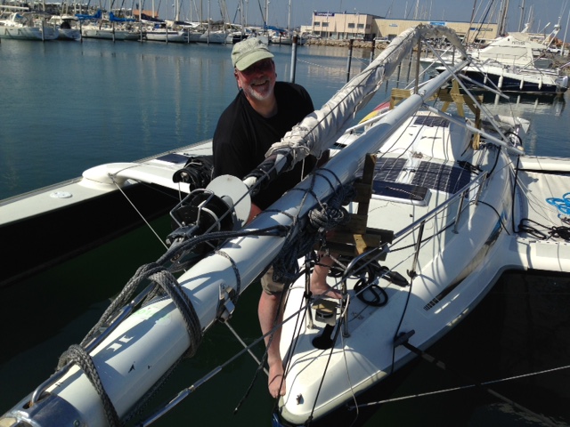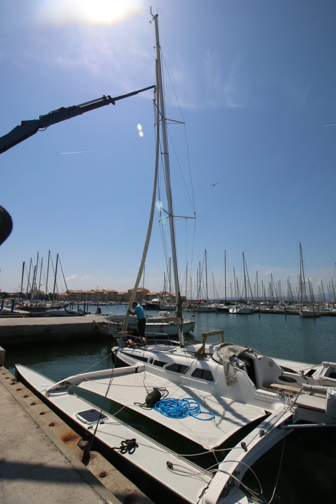 Diesen Plan haben anscheinend einige hier. Unser Steg leert sich gegen 13:00 merklich. Auch die Heavenly Twins, der Katamaran, der mich schon auf der Flusstour nach Bordeaux begleitet hat, ist dabei. Wir allerdings nicht. Das Aufstellen des Masts ging natürlich nicht so ruckzuck wie erhofft. Der Hafenmeister stand zwar schon um 11:00 bereit aber wir waren noch nicht ganz vorbeitet. Die ganzen Fallen und Wanten waren total vertüdelt und verknotet und der Strop um den Mast anzuheben war nicht vorbereitet. Der Befestigungsbolzen für das Vorstag wollte partout nicht ins Loch und der Sicherungssplint erst recht nicht. Das hat fast eine halbe Stunde gekostet. Aber schließlich steht der Mast und wir gehen wieder an den Steg.