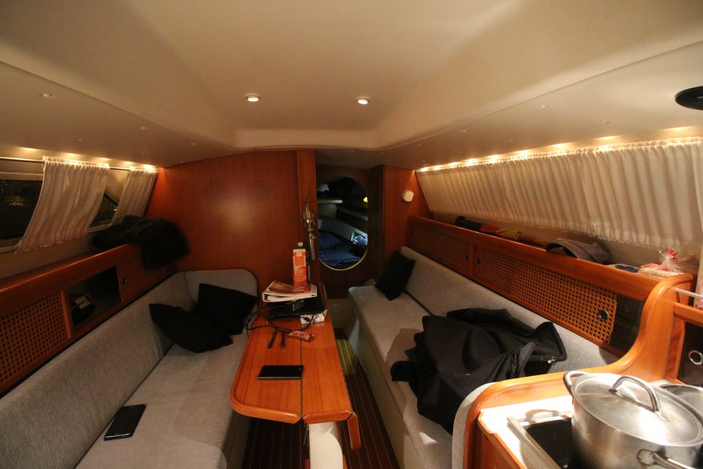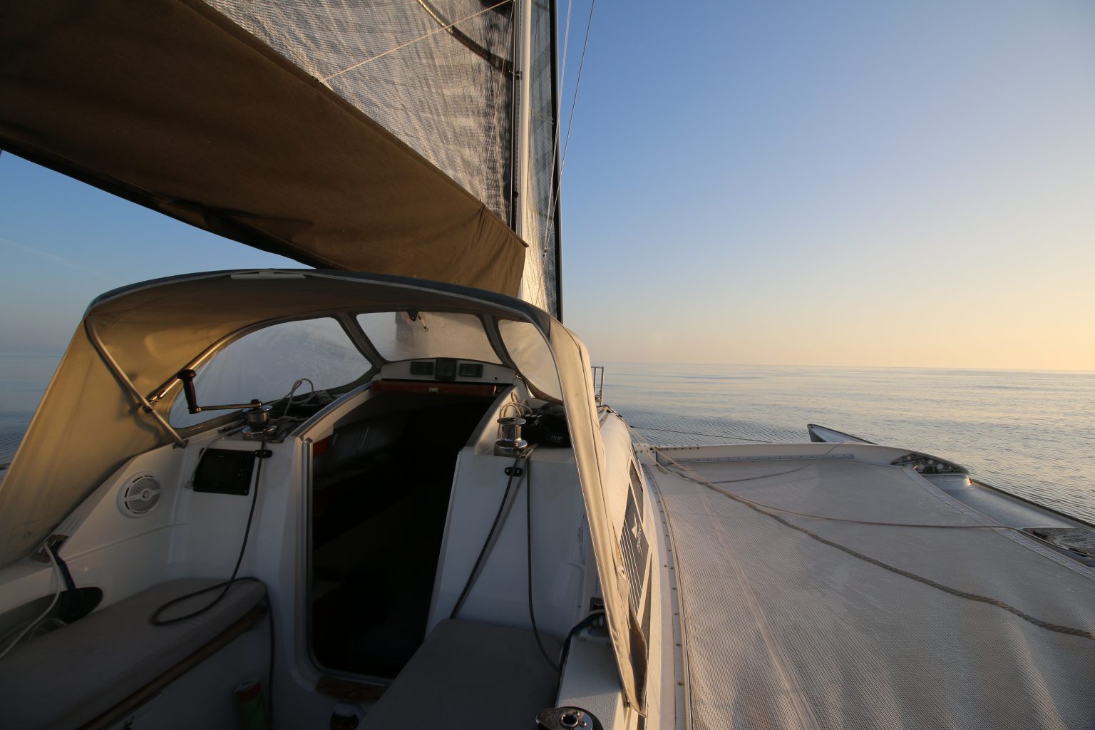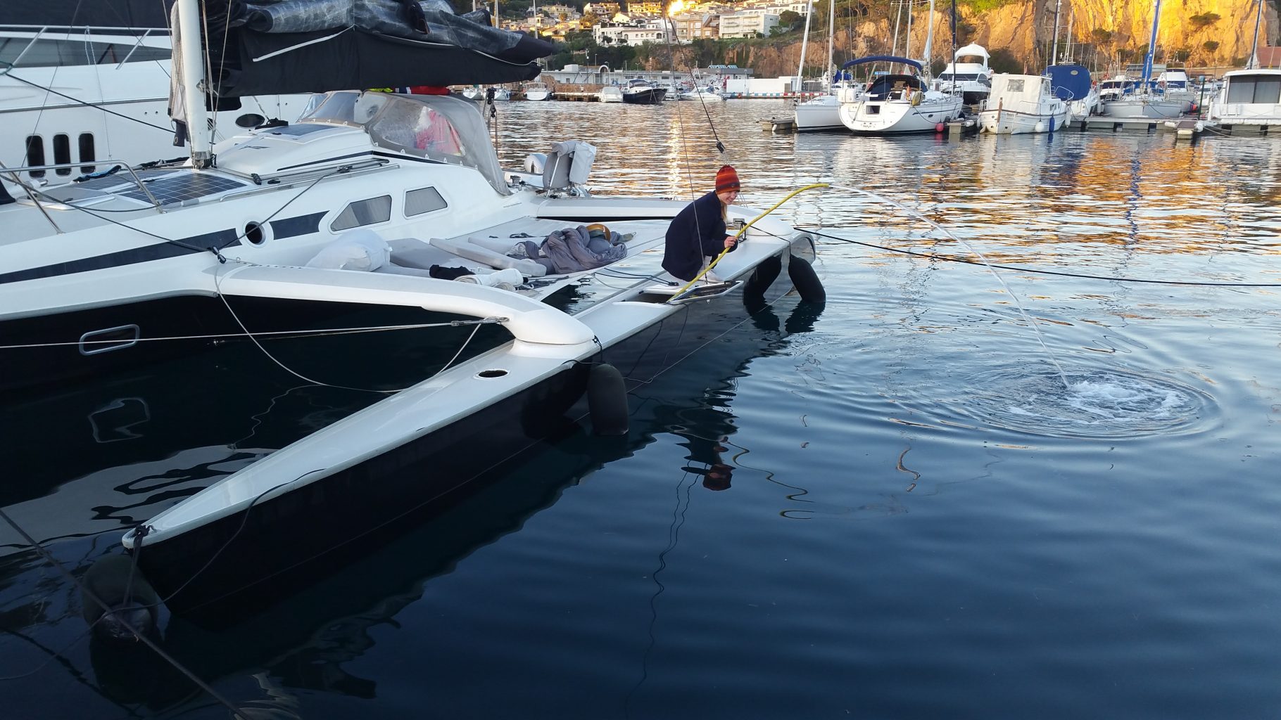 5. Wende: wir sind wieder auf Höhe Sant Feliu. Es ist mittlerweile kurz nach 4 Uhr. Irgendwie bewegt sich Trinity plötzlich so schwerfällig. Der Bug des Leeschwimmers taucht in jeder Welle komplett weg. Und das Heck fühlt sich so hoch an. Dabei hat der Wind doch eigentlich abgenommen! Wasser im Vorschiff? Seeventile undicht? Ich hechte nach vorne und schaue unter die Voschiffskoje. Alles trocken.