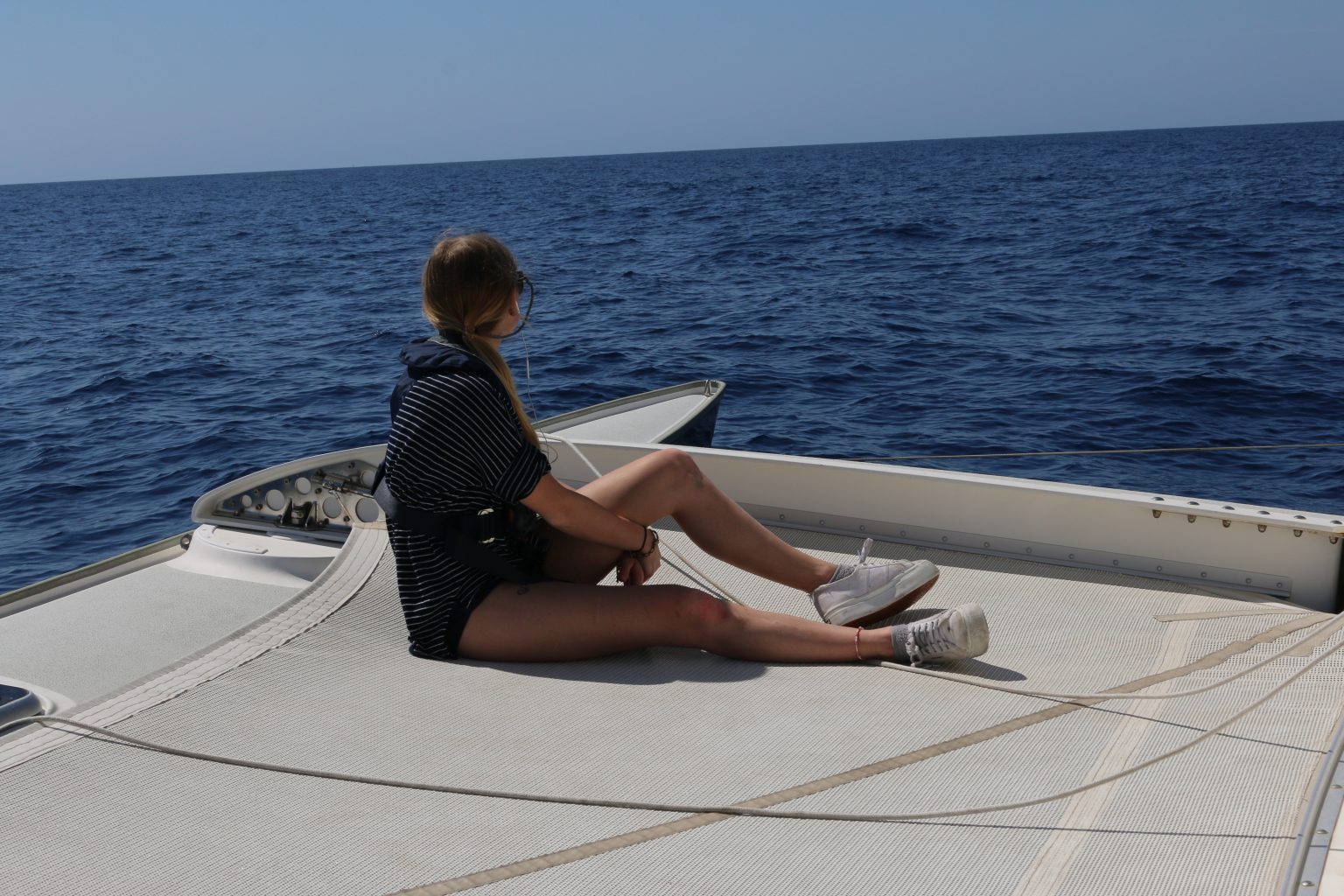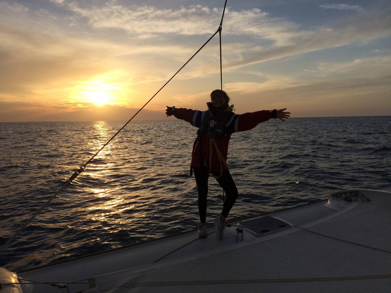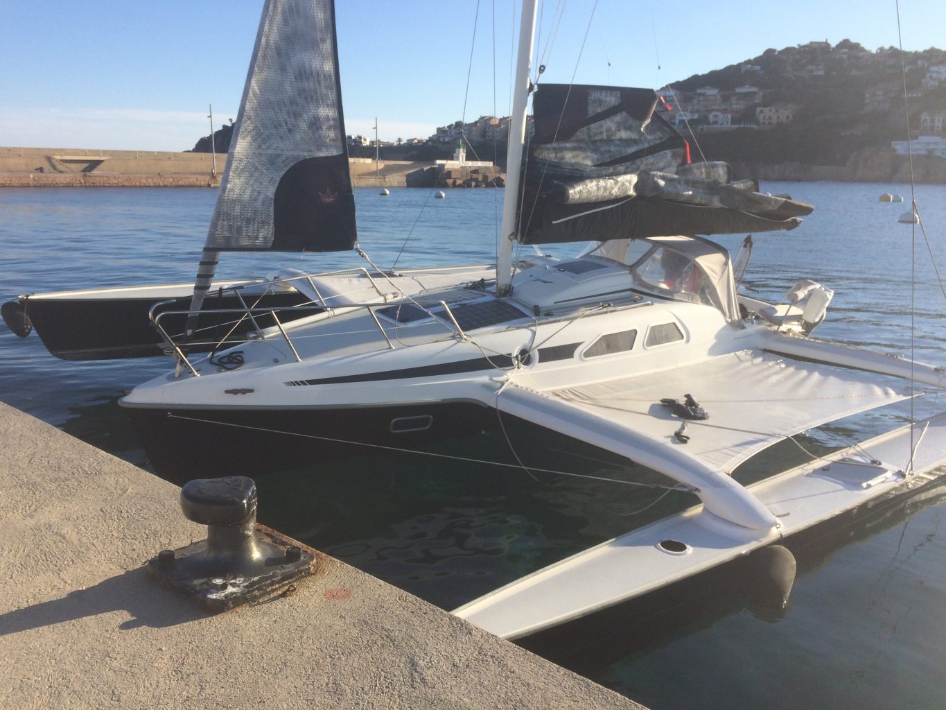 5. Wende: wir sind wieder auf Höhe Sant Feliu. Es ist mittlerweile kurz nach 4 Uhr. Irgendwie bewegt sich Trinity plötzlich so schwerfällig. Der Bug des Leeschwimmers taucht in jeder Welle komplett weg. Und das Heck fühlt sich so hoch an. Dabei hat der Wind doch eigentlich abgenommen! Wasser im Vorschiff? Seeventile undicht? Ich hechte nach vorne und schaue unter die Voschiffskoje. Alles trocken.