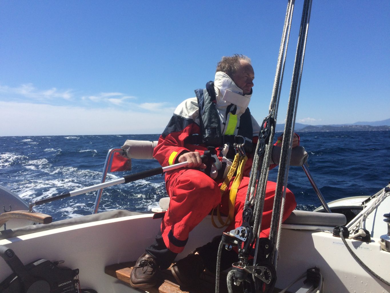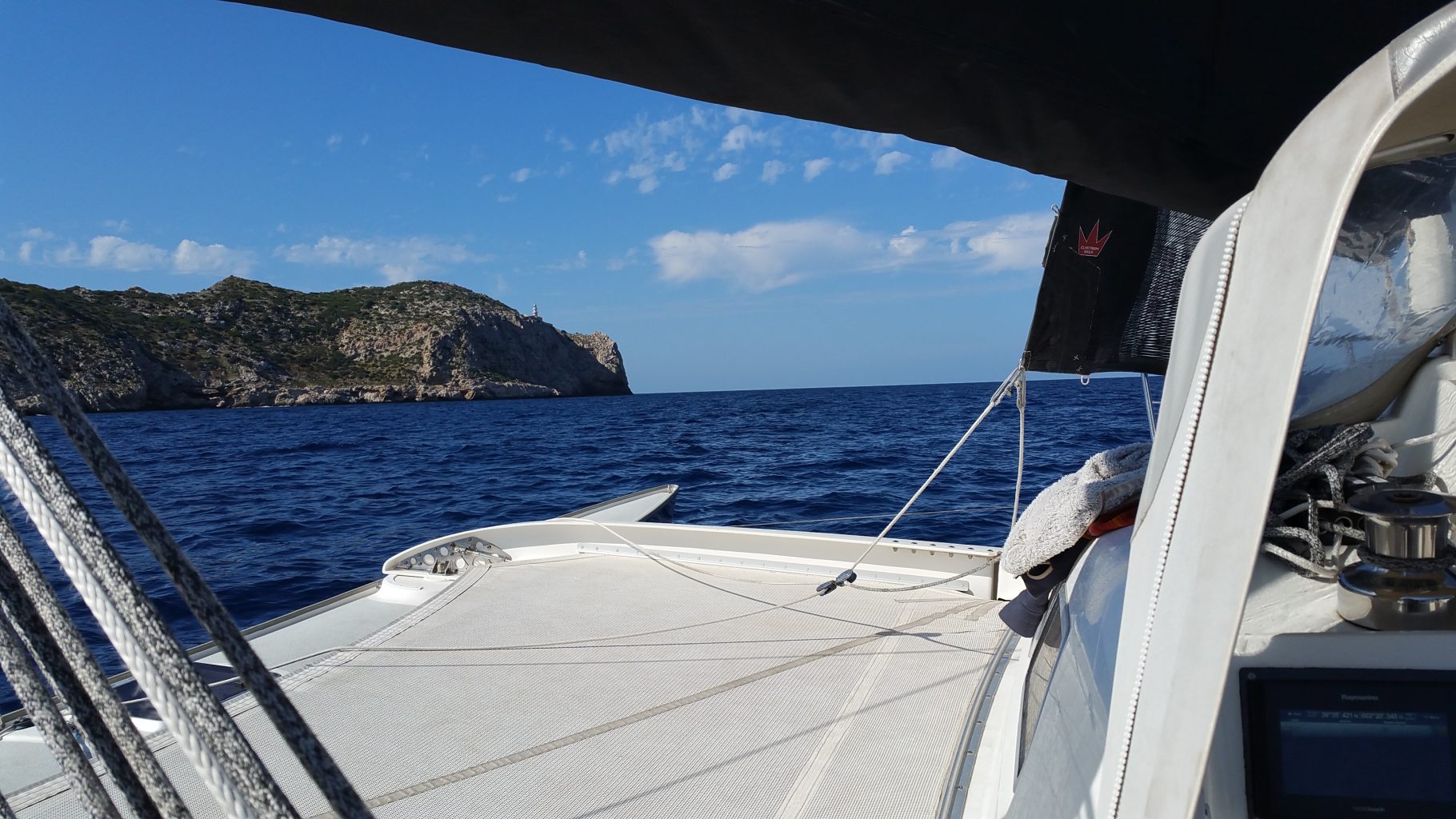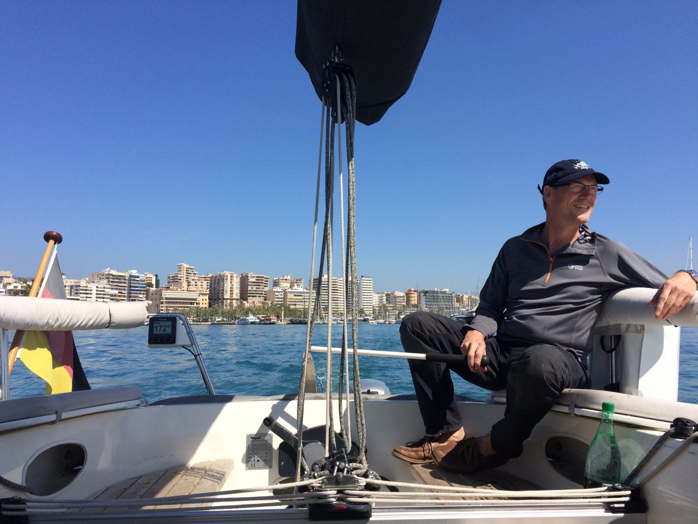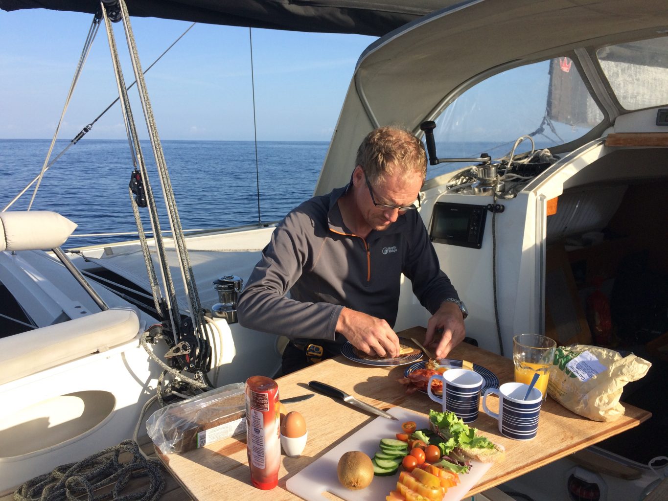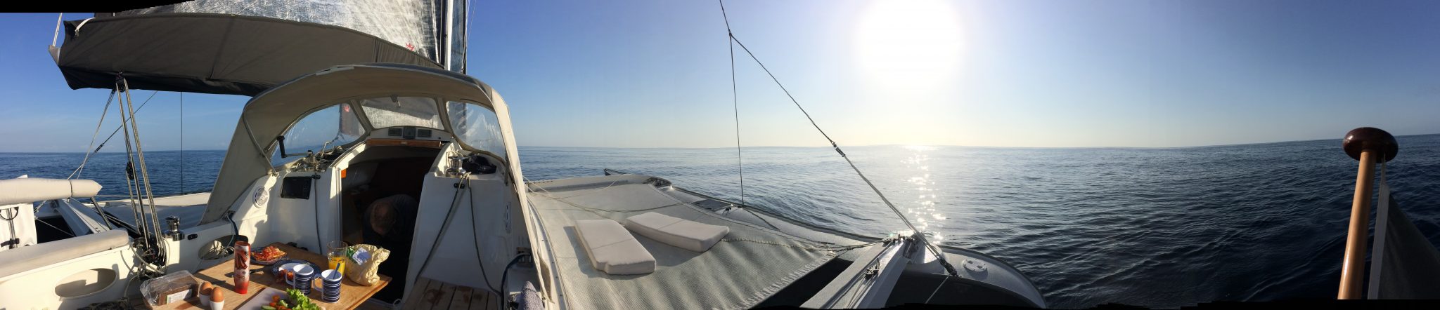Nach der ersten Wende macht sich Ernüchterung breit. Ein Wendewinkel von 120 Grad ist nicht toll. Mal sehen wie weit wir so kommen. Der Wind soll im Laufe des Tages weiter abnehmen. Dann klappt es mit der Höhe am Wind hoffentlich auch wieder.