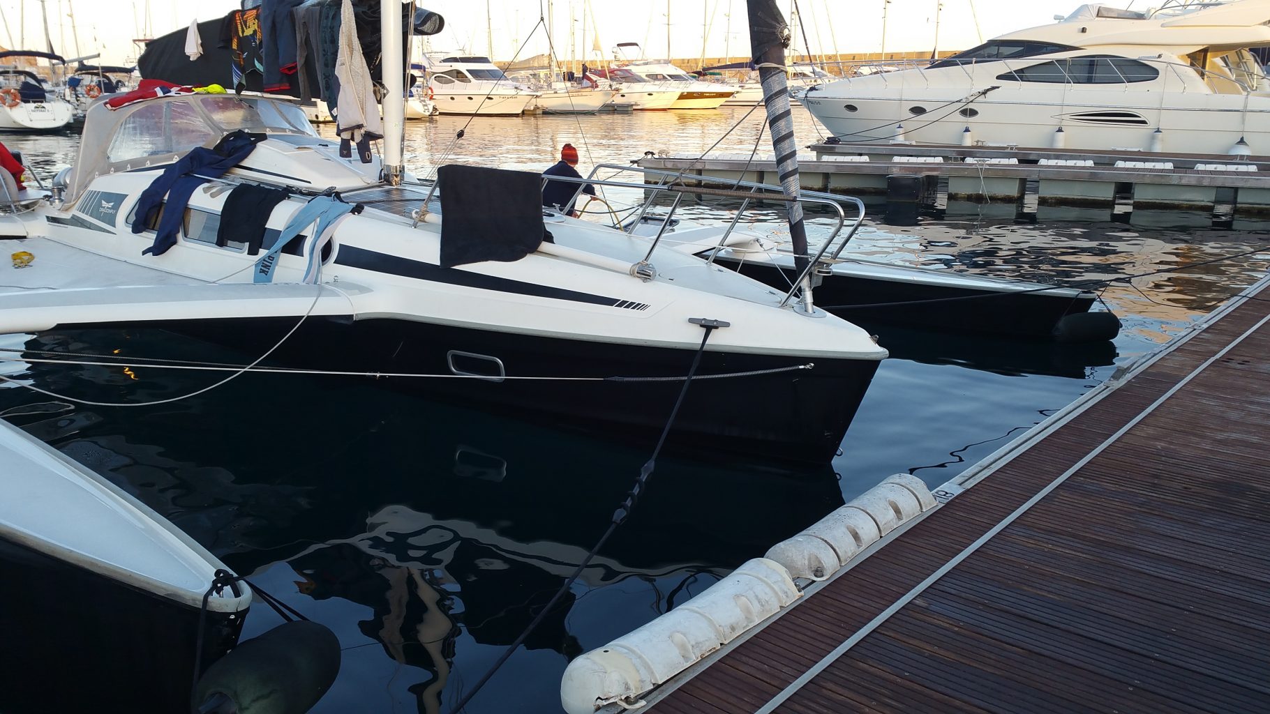 Nun kommt auch der Marinero vorbei und will wissen was wir hier treiben. Als er das Dilemma erkennt, schaut er leicht bedröppelt und geht sein Schlauchboot holen, um uns abzuschleppen. Der Motorbootskipper ist eine große Hilfe. Er ist Dauerlieger hier und kennt sich aus. Er spricht Spanisch, Catalan, Englisch, Deutsch und als Belgier auch Französisch und Flämisch. Wir werden in die Box neben seiner geschleppt.