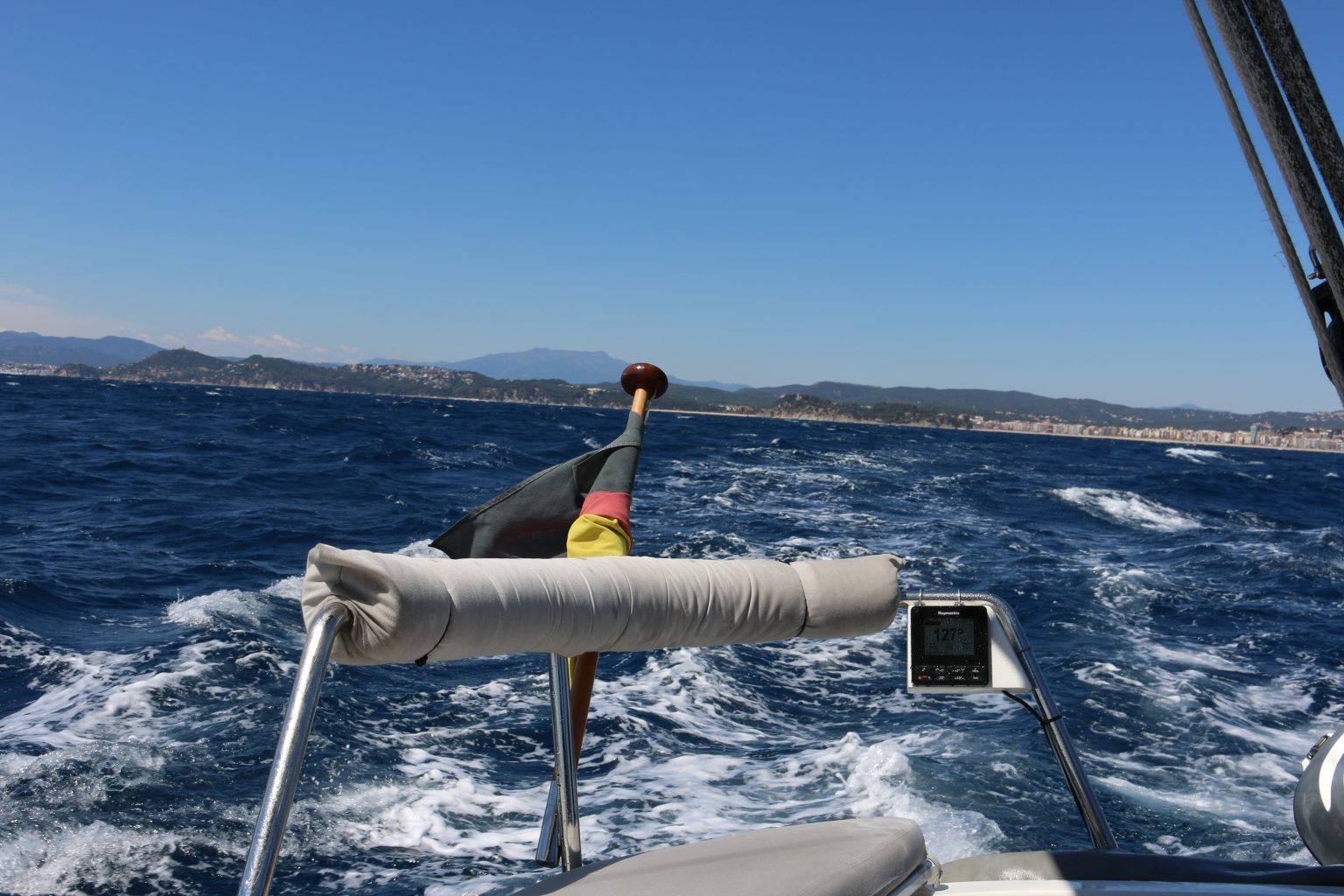 Wir treiben ab. So erreichen wir Sant Feliu nie. Fock raus, mal sehen ob wir so den Kurs halten können. Es reicht! Wir können mit gereffter Fock und ca 3.5 Knoten Fahrt unseren Nothafen anlaufen.