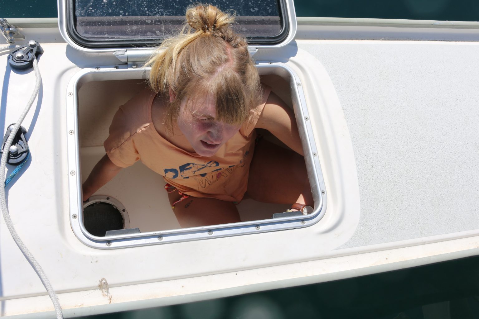Bestandsaufnahme: Meine Vermutung stimmt. Irgendwie sind auch die anderen Bereiche des Schwimmers vollgelaufen, allerding nur sehr langsam. Werde bei nächster Gelegenheit in der Werft anrufen, um nachzufragen, ob das so richtig ist. Der Marinero kommt mit einer großen Tauchpumpe, die leider nicht durch die Inspektionsluke passt. Über das Staufach können wir zumindest einen Teil des Wassers auspumpen. Der Motorbootskipper hat eine Handpumpe. Mit der pumpt Anna am folgenden Tag mühsam das restliche Wasser aus dem Rumpf.